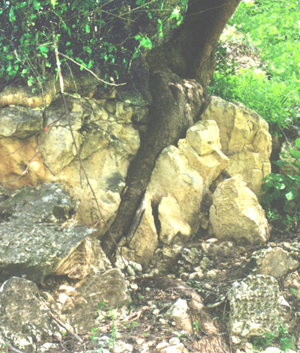 _ביקוע על-ידי שורשי צמחים_. תופעה של ביקוע סלעים על-ידי שורשי עצים היא דוגמה לבלייה ביוגנית-מכנית. (ש.ש.).