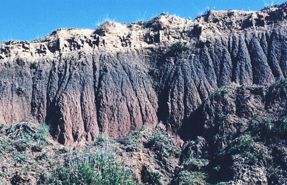 _ריכוז חרסית בקרקע חמרה_. קרקע חמרה שיש בה אופק חרסיתי, המפריע לחלחול המים ומגביל את חדירת שורשי הצמחים לעומק, מכונה קרקע נזאז (nazaz soil). צבעו האפור-שחור של האופק החרסיתי שבתמונה נובע מתהליכי חיזור המתרחשים בשכבת החרסית האטומה ומאפיינים קרקע גליי (gley soil). (ש.ש.).