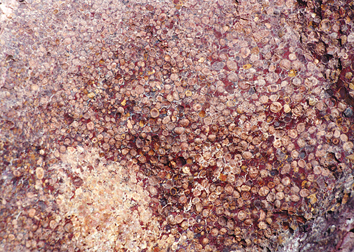 _מבנה תצבירי פיזוליתי בלטריט_. מבנה תצבירי פיזוליתי (דמוי אפונים, pisoliths) בלטריט (laterite) "מאובן" מתור היורא (תצורת משחור) במכתש-רמון. לטריט נוצר בתנאי שטיפה נמרצים באקלים גשום וחם (טרופי) ומניחים כי תנאים כאלה שררו באזורנו בתור היורא. (ש.ש.).