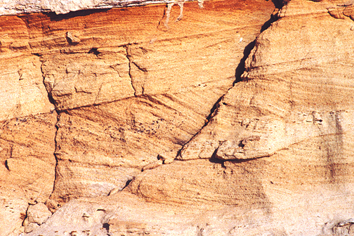 _איור 17.4: שיכוב צולב._ שיכוב צולב (cross bedding) באבני חול נוביות מתור היורא (תצורת אנמר) במכתש רמון. בשיכוב זה רובדי הסלע ערוכים בכיוונים צולבים. שיכוב צולב נוצר כאשר חלקיקי המשקע מורבדים על-ידי זרמי מים, כבמקרה זה, או משבי רוח, ונערמים לרבדים הנערכים בכיוונים שונים. (ש.ש.)