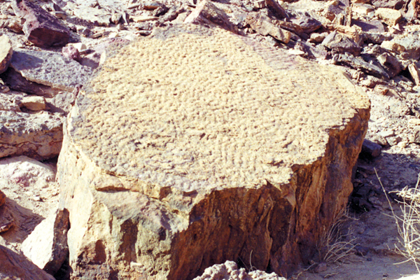 _איור 17.8: גלונים בפני שכבת סלע._ גלונים (ripple marks) בגגו של גוש סלע שניתק מאבן חול מתור היורא (תצורת אנמר) במכתש-רמון. אלה הם תוואים דמויי גלים בפני שכבת סלע, הנוצרים במהלך תנועה של משקעים חוליים. גלונים אלה נוצרו בעבר בעת שהחול, שממנו נוצרה אבן החול, כיסה את פני השטח. ההתקשות לסלע שמרה את מבנה שלהם. (ש.ש.)