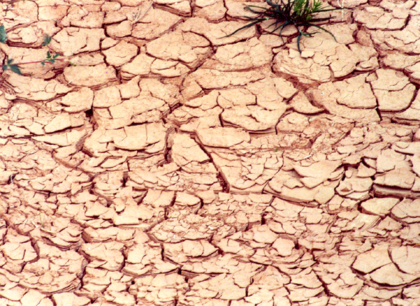 _איור 17.10: סדקי בוץ._ סדקי בוץ (mud cracks) בפני קרקעית בוצית של אפיק נחל. אלה הם תוואים דמויי סדקים הנוצרים בעת התייבשות קרקעית בוצית שבמהלכה הבוץ מתכווץ ונסדק למצולעים. (ש.ש.)
