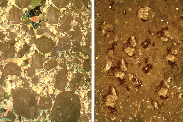 _איור 17.17: מרקם של אבן גיר._ מרכיבי המרקם העיקריים של אבן גיר, כפי שהם נראים בשקף של סלע זה מבעד למיקרוסקופ מקטב-אור. מימין, אלוכמים במטריקס של קלציט מיקרו-גבישי המכונה מיקריט (microcrystalline calcite or micrite). משמאל, אלוכמים במלט של קלציט ספרי המכונה ספריט (sparry calcite, sparite or spar). אלוכמים (allochems) הם גרגרים או גופים גסים במרקם אבן הגיר (בין מקטבים מצטלבים; שדה הראייה: כ-3 מ"מ). (ש.ש.)