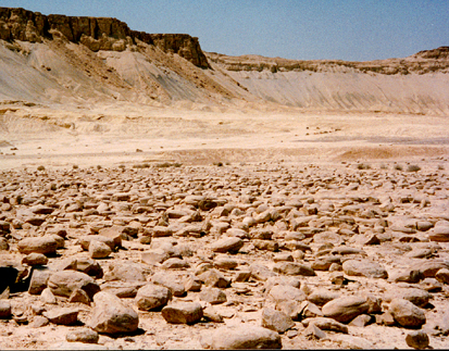 _איור 17.21: סלע פוספוריט._ סלע פוספוריט (phosphorite) מתקופת הקמפן (חלקה העליון של תצורת מישאש) בשדה הבולבוסים באזור צין. זה סלע המורכב מגבישים זעירים של המינרל אפטיט ומכיל גם גיר. הפוספוריט נוצר בתנאים שבהם יצורים מרכזים זרחת סידן ממי הים. שכיחים בו מאובנים של אדרות דגים ושיני דגים. הפוספוריט במחשוף זה מכיל בולבוסים, שהם תרכיזים של גיר (carbonate concritions). תרכיזים אלה שוחררו באמצעות סחיפה מן הסלע ויצרו את שדה הבולבוסים באזור צין.(ש.ש.)