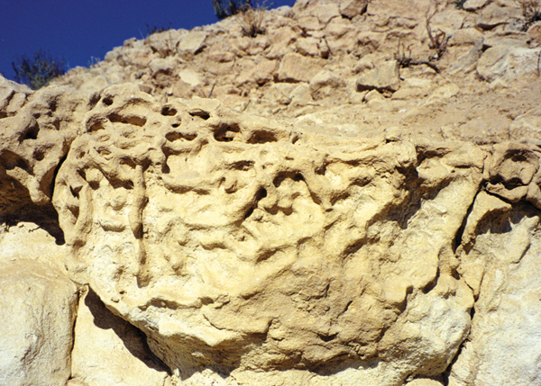 איור 17.23_: סימני נבירה._ סימני נבירה (filled burrows) על פני סלע גירי בנגב. אלו תוואי מחילות של יצורים שהשתמרו בסלע, והבלייה הבליטה אותם על פניו. מקורם בבעלי חיים שנברו בבוצה שממנה נוצר הסלע ומחילותיהם מולאו במשקעים. (ש.ש.)