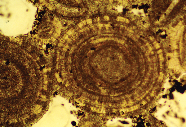 _איור 17.30: מרקם של גיר אואוליתים._ מבנה פנימי של אואוליתים כפי שהוא נראה בשקף של סלע זה מבעד למיקרוסקופ מקטב-אור. האואוליתים (oolite ,oolith) הם גופים כדוריים בגודל של חול הבנויים במקורם ממעטפות של גבישי ארגוניט, המקיפות זו את זו ויוצרות מבנה פנימי היקפי (קונצנטרי). (שדה הראייה: כ-1.5 מ"מ)
