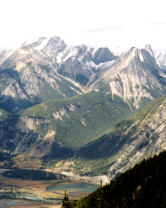 _תמונת השער - פרק 7: רכסים בהרי הרוקי_. רכסי הרים בתצפית מ"הר הגופרית" סמוך לעיר באנף (Banff) שבהרי הרוקי במערב קנדה. שרשרת הרי הרוקי מתמשכת במערב אמריקה הצפונית התרוממה בתהליכים הנובעים מטקטוניקת הלוחות. (ש.ש.)