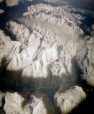 _איור 7-1: רכסים בהרי האלפים_. רכסי הרים גבוהים ומושלגים בהרי האלפים בשווייץ במבט מהאוויר. שלשלת הרי האלפים התרוממה באזור הפחתה שבו נע לוח אפריקה-ערב צפונה לעבר לוח אירואסיה, תוך סגירה של אוקיינוס קדום המכונה טתיס (Tethys). (ש.ש.)
