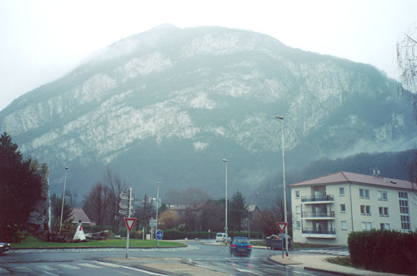 _איור 7-4: סלעי משקע ברכס הרים._ סלעי משקע ימיים מקומטים בהרי האלפים בצרפת. תהליכי ההתרוממות של שרשרת ההרים גורמים להתמקמות של סלעי משקע ימיים ברכסי ההרים ביבשה. (ש.ש.)