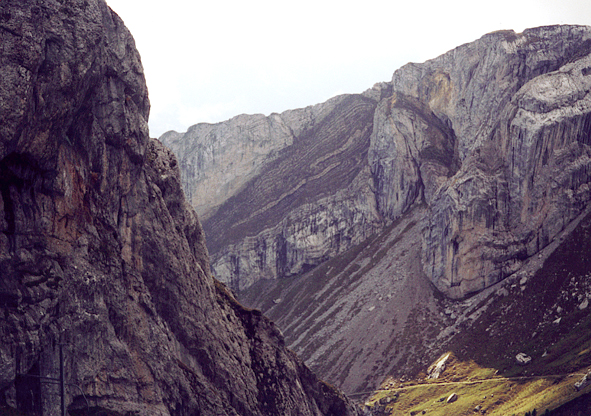 _איור 7-5: קימוט והעתקה בסלעי משקע._ קימוט (folding) והעתקה (faulting) בסלעי משקע ימיים ברכס הר פילטוס (Pilatus) שבהרי האלפים בשווייץ. מאמצי דחיסה וגזירה הפועלים בשרשרת ההרים מקמטים את הסלעים ומעתיקים אותם. (ש.ש.)