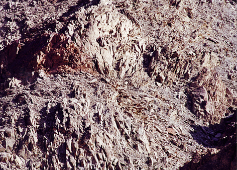 _איור 7-15: צפחת אילת_. צפחת אילת (Eilat Schist) היא סלע מותמר מהפריקמבריום הנחשף באזור אילת ונמנה עם סלעי השילד הערבו-נובי. זהו הסלע המותמר הקדום ביותר הנחשף באזור אילת. ההתמרה (metamorphism) של סלע זה התרחשה לפני כ-800 מיליון שנים. מקורה של הצפחת אילת בתוצרי בלייה חרסיתיים של סלעים געשיים, שהובלו מקשתות האיים אל תהום אוקיינית והצטברו בה בסדרות עבות. כתוצאה מנחיתתם לעומק בתהליכי הפחתה, הותמרו המשקעים החרסיתיים לסלע צפחה. (ש.ש.)