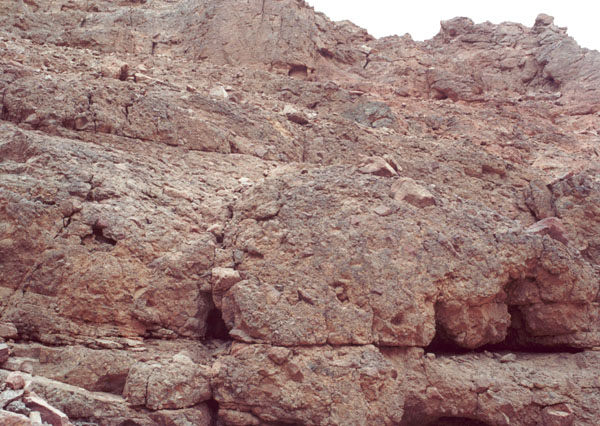 _איור 7-18: קונגלומרט אילת_. קונגלומרט אילת (Eilat Conglomerate) הוא סלע משקע משלהי הפריקמבריום שנמנה עם סלעי השילד הערבו-נובי הנחשפים באזור אילת. מקורו בתהליכי סחיפה וגידוע שפעלוו על שרשרת ההרים הקדומה בשלב ה"געשי-קונגלומרטי". (ש.ש.)