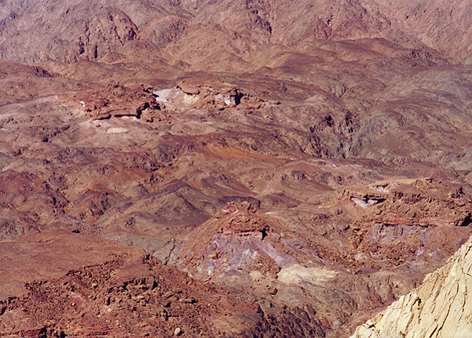 _איור 7-19: מישור הגידוע של השילד הערבו-נובי_. פני מישור הגידוע (הפנפליין) של השילד הערבו-נובי בתצפית לעבר סיני ממעלה גשרון. כשדעכה הפעילות האורוגנית בשלהי הפריקמבריום גדעו כוחות הבלייה לאטם את שרשרת ההרים ונוצר מישור גידוע רחב ממדים - פנפליין בגג השילד ערבו-נובי. מעל המישור זה הורבדו במהלך הזמן הגיאולוגי סלעי משקע וכוסו את סלעי התשתית היבשתית. כיום מסירים תהליכי סחיפה את סלעי המשקע וחושפים את סלעי התשתית. על מישור הגידוע שנחשף נראים עדיין שרידים של סלעי משקע (משוכבים) שטרם הוסרו (ש.ש.)