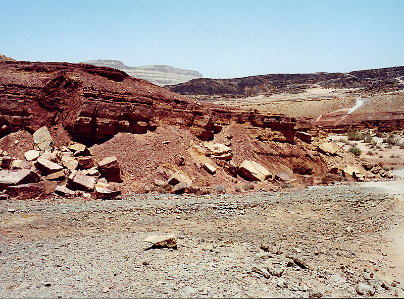 _איור 4-36: הקווסטה האדומה של תצורת ארדון._ השכבות הנטויות של תצורת ארדון מתור היורא במכתש רמון יוצרות רבדה (קווסטה) בנוף המכונה בשל צבעה הקווסטה האדומה. בקווסטה זו