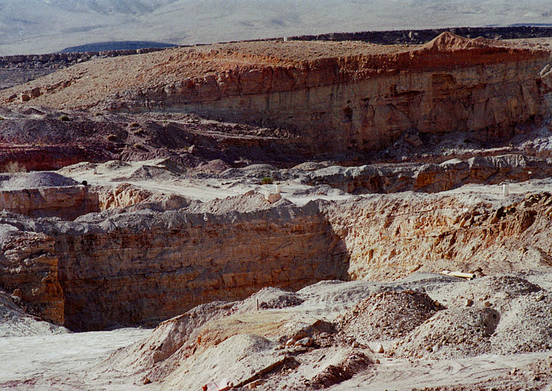 _איור 4-38: מכרה קאולין.} הקאולין מצוי בעדשות בינות לאבני החול של תצורת אינמר מתור היורא במכתש רמון. זהו סלע חרסיתי המכיל את המינרל קאוליניט והורבד בביצות או באגמים שנתהוו בינות לחולות. חומר הגלם משמש לתעשיית הקראמיקה ומוסף בהפקת חומצה זרחתית. (ש.ש.).
