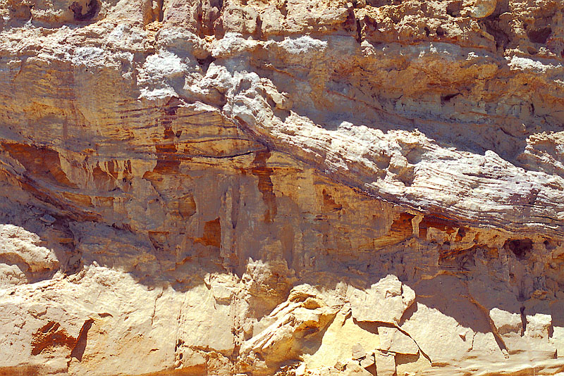 _איור 4-48: תצורת חתירה._ אבני חול מגוונות של תצורת חתירה מתור הקרטיקון התחתון במעלה העצמאות במכתש רמון. מגוון הצבעים - צהוב, אדום וסגול - נובע מציפוי הגרגרים במינרלים של ברזל, המטיט ולימוניט. התצורה הורבדה בסביבה יבשתית בתנאים נהריים (פלוביאטיליים). (ש.ש.).