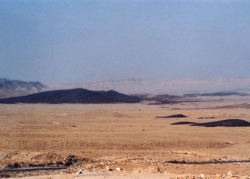 _איור 4-50: סלעי בזלת בתצורת חתירה._ רצועת הגבעות השחורות וגבעת געש בתצורת חתירה מתור הקרטיקון התחתון במכתש רמון. הגבעות השחורות הסמוכות למצוק בנויות סלעי בזלת והנן שרידים לזרמי בזלת שקלחו בתור הקרטיקון התחתון. הגבעה השחורה הגדולה, המכונה גבעת געש, הינה כנראה שריד לאחד מהרי הגעש שפעלו באזור באותה עת. (ש.ש.).