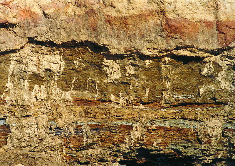 _איור 4-54: אבן חול גלאוקוניטית._ אבן חול גלאוקוניטית ירקרקה בבסיס פרט חביון של תצורת חצרה מתור הקרטיקון התחתון במעלה העצמאות במכתש רמון. גלאוקוניט הוא מינרל ירקרק שהיווצרותו מאפיינת הצפה ימית (טרנסגרסיה). הוא מציין את חזית ההצפה הימית שהתרחשה לקראת סוף תור הקרטיקון התחתון. (ש.ש.).