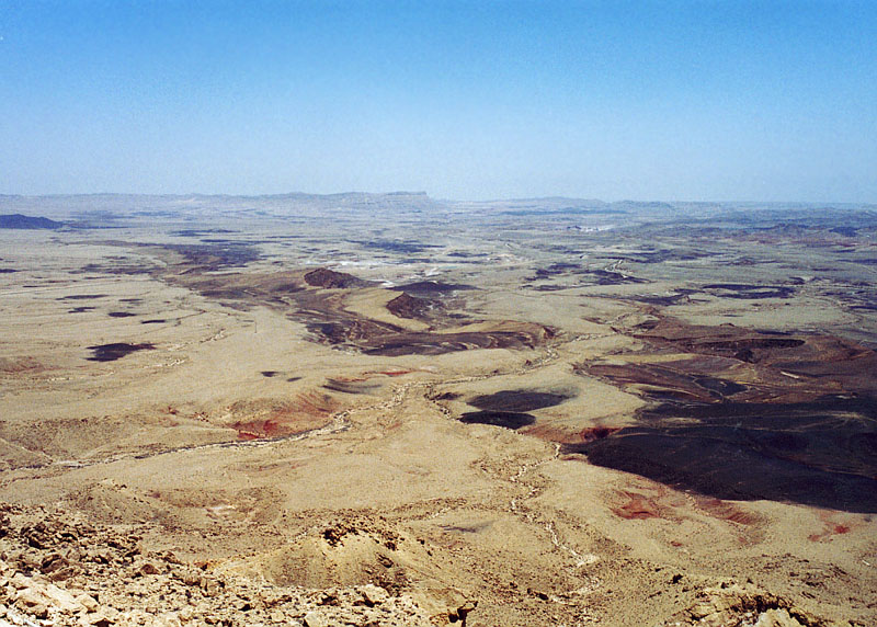 _איור 6-18: מכתש-רמון._ מכתש-רמון (המכתש הענק) חתור ברכס מחמל. התחתרות המכתש בקמר גיאולוגי חושפת כאן יחידות סלעים מתור הטריאס עד לתור הקרטיקון. (ש.ש).