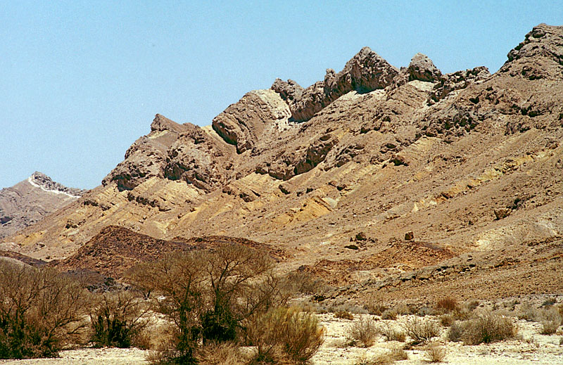 _איור 6-20: הדופן הדרום-מזרחית של מכתש-רמון._ בדופן הדרום-מזרחית של מכתש-רמון נוטות השכבות בתלילות לדרום-מזרח. נטייה זו משקפת את מבנה הקמר הבלתי סימטרי, שבאגפו הדרום מזרחי נטיית השכבות חריפה. (ש.ש.).