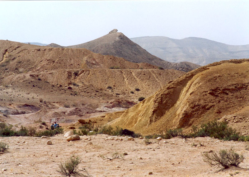 _איור 6-28: קונגלומרט חצבה במכתש חתירה._ הגוש בפסגת הגבעה נותר כשריד לקונגלומרט הבסיס של תצורת חצבה. מחשוף הקונגלומרט נמצא בגובה טופוגרפי דומה לזה שמחוץ למכתש. לפיכך מניחים כי התחתרות מכתש חתירה החלה בתקופת המיוקן, בטרם הורבד הקונגלומרט (ש.ש.).