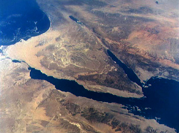 _איור 6-54: ים סוף ובקע ים-המלח._ יצירת בקע ים-המלח קשורה בתנועת הפתיחה שהתרחשה ומתרחשת בים-סוף ובה מתרחק לוח ערב מלוח אפריקה. בתחילת התהליך התרחשה פתיחה הן בים-סוף והן במפרץ-סואץ, כך שכל פתיחת ים-סוף נספגה על-ידי פתיחת מפרץ-סואץ. בשלב מסוים בתקופת המיוקן התיכון פסקה הפתיחה במפרץ-סואץ כמעט לגמרי, בעודה נמשכת בים-סוף. הפסקת ההתרחקות במפרץ-סואץ חייבה היווצרות קרע בלוח ערב, שעליו חלה תנועת החלקה. כך נוצר העתק החילוף (הטרנספורם) של ים-המלח. (סוכנות החלל של ארצות-הברית, NASA, תמונה 10074516).