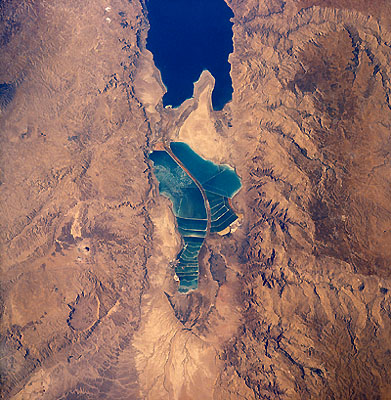 _איור 6-58: בקעת ים-המלח._ בקעת ים-המלח הנה שקע עמוק בתוך בקע ים-המלח, שהיווצרותו קשורה במתיחה עקב התנועה לאורך ההעתק. זהו מבנה מתיחה המכונה גרבן מעויין שנוצר בתוך בקע ים-המלח, כתוצאה מתנועת עבר-הירדן צפונה לאורך קו שבירה מזוגזג. ים המלח מופרד כיום לשני אגנים. הצפוני עמוק, קרוב ל-400 מטרים מתחת לפני ים-המלח. האגן הדרומי רדוד ומחולק באמצעות סכרים לברכות אידוי של מפעלי ים-המלח המנצלים את מי ים-המלח להפקת אשלג. בין שני האגנים מפרידה לשון ים-המלח המהווה כיום מיצר יבשתי. (סוכנות החלל של ארצות-הברית, NASA, תמונה 20213206).