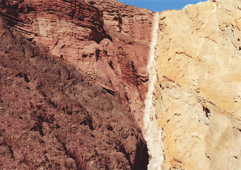 _איור 6-77: העתק עמרם._ העתק עמרם נמנה עם העתקי השוליים של בקע ים-המלח. ההעתק מעתיק סלעי המשקע מול סלעי התשתית הפריקמברית. (ש.ש.).