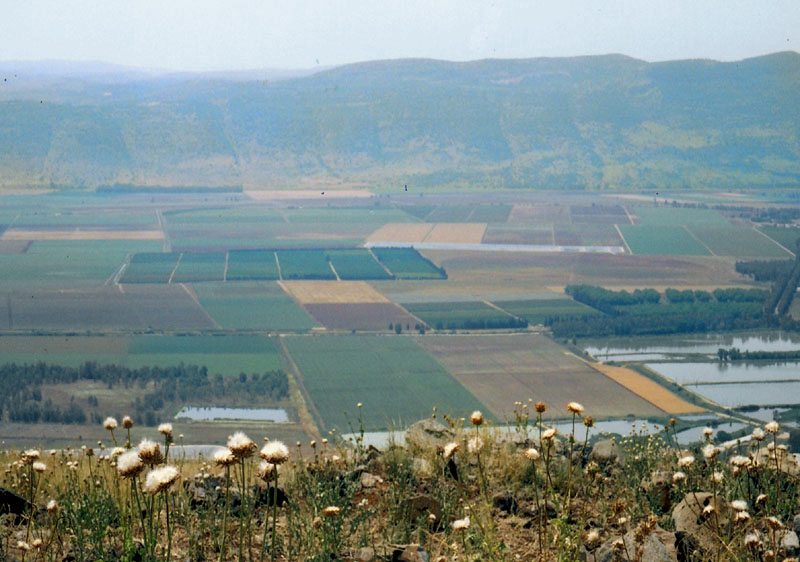 _איור 6-84: מבט מהגולן לעמק החולה ולגליל העליון._ בחלקם העליון של הרי הגליל העליון אפשר לראות מעין רמה - "במת ההר" של הגליל העליון. (ש.ש.).