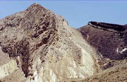 _15_ מבט מקרוב של הגוש ההפוך הגוש ההפוך בנוי שכבות סלעים מתקופת הטורון. ימינה ממנו נחשפות שכבות סלעים מתקופת הסנון; בפסגה סלעי צור כהים מתצורת מישאש ומתחתם סלעי קירטון בהירים מתצורת מנוחה, המכוסים בדרדרת כהה של הצור. (ש.ש. או"פ).